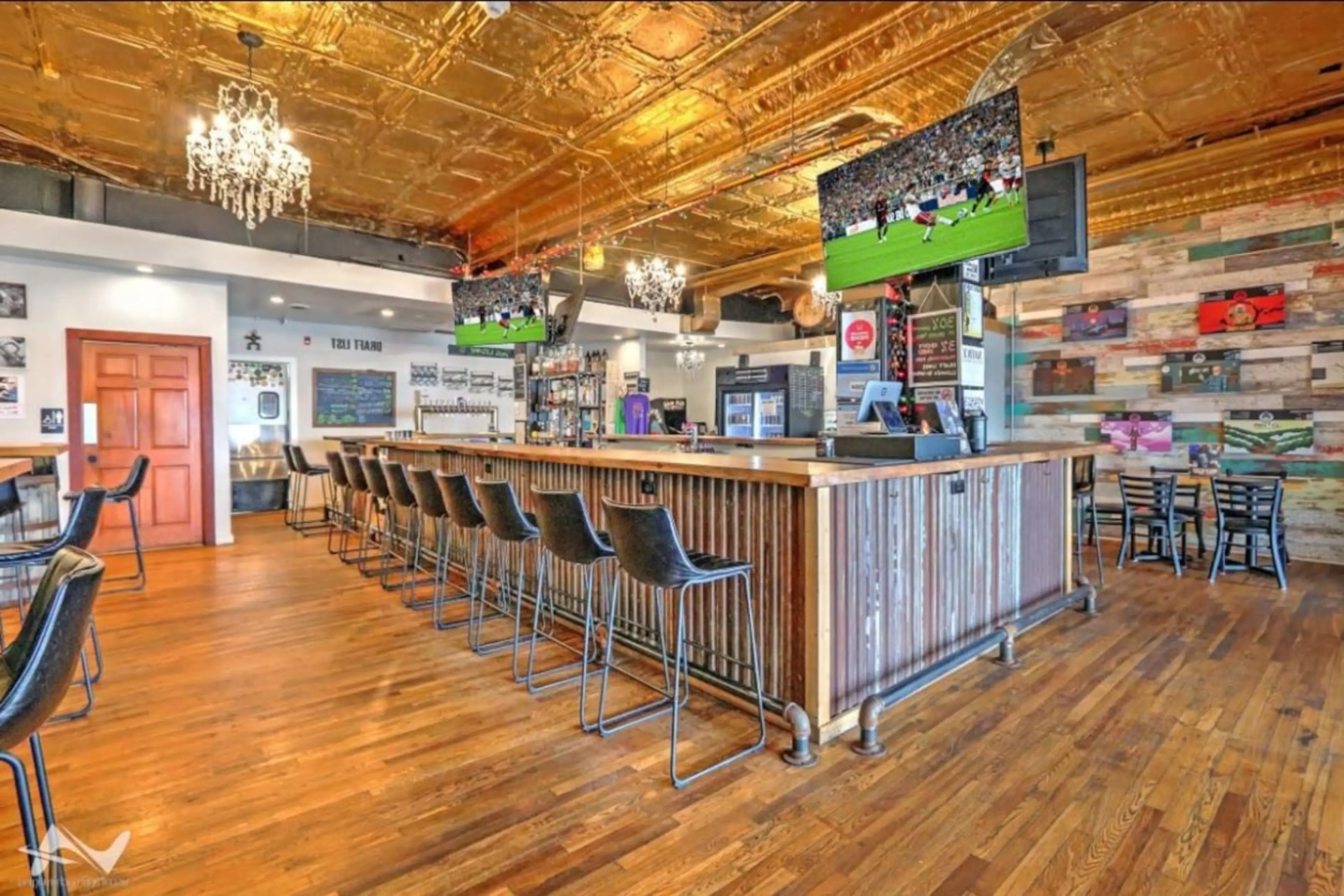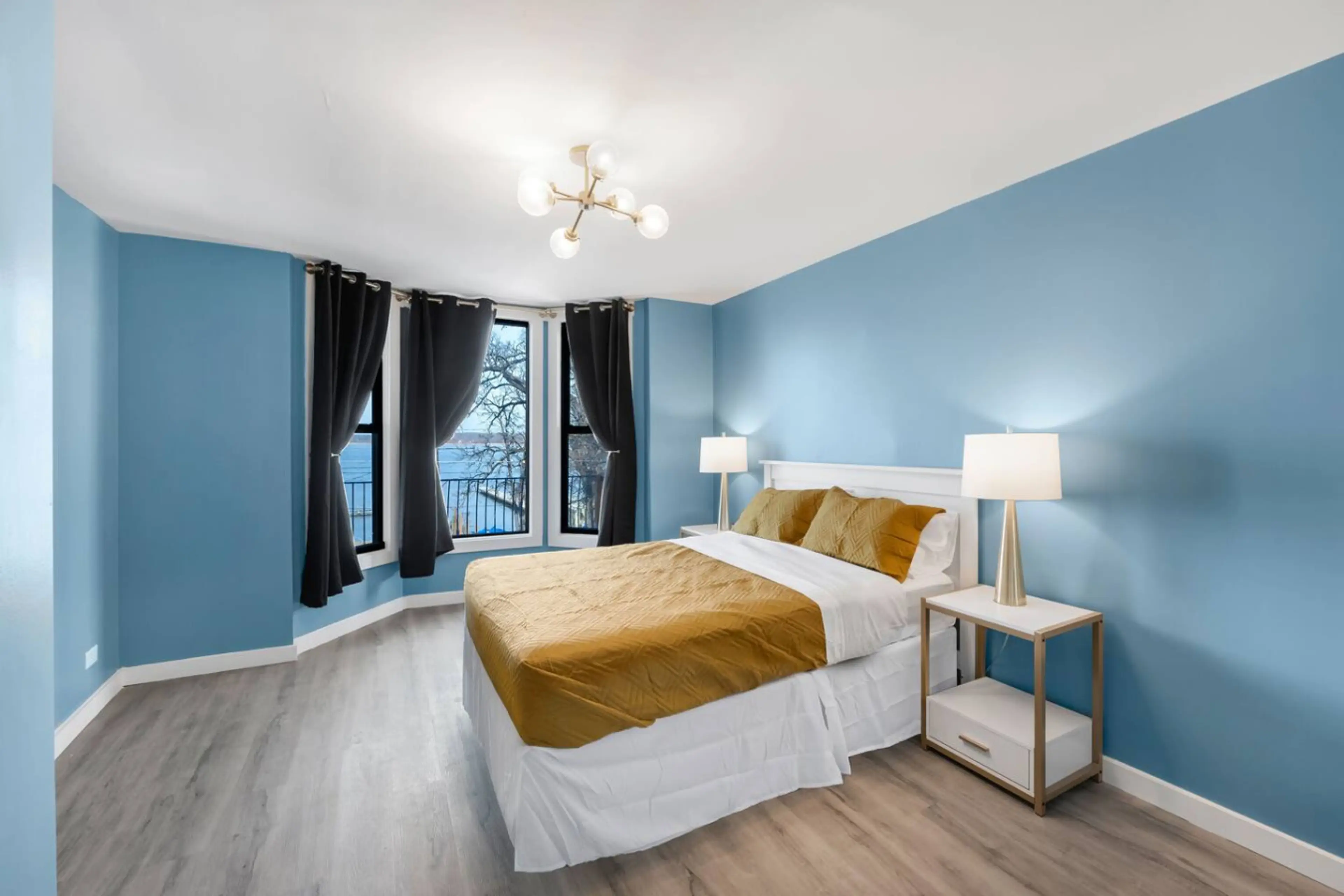 Step back in time with modern comfort in our 2-Bedroom Al Capone Lakeview Suite, set in a beautifully restored 1920s Art Deco hotel. Primary Bedroom: Accented with a bold steel-blue wall, this room is styled with white and gold frame furnishings, elegant black curtains, and a striking six-branch go...